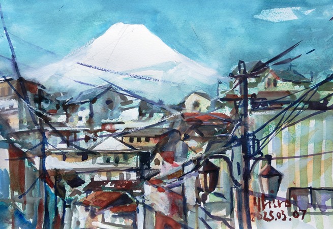 寒くてもお天気がいい日。遠く人家の上に白い富士山などを見ると気分が高揚する。スケッチは先週、都心でも雪がちらついた日の翌日。