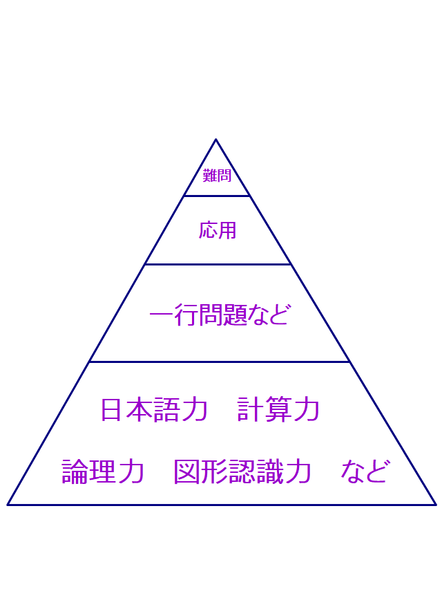 合格ピラミッド合格に至るプロセス、量については、上記の図の様に考えています。一番下の、「日本語力 計算力 論理力 図形認識力 など」が最も大切だと考えています。ブログをお読みいただき、ありがとうございます。この記事がなにかのお役にたちましたら、2日に1回、以下のタグをクリック頂ければ、とてもありがたいです。にほんブログ村中学校受験ランキング大学受験ランキング