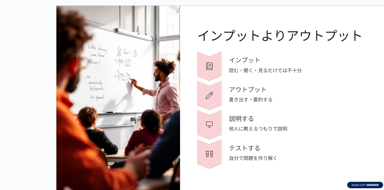 プレゼン(スライド)生成ツール Gamma のすごさプレゼン(スライド)生成ツール、Gammaがすごいですね!まず、chatGPT、geminiなどに、「学習効率を上げるプレゼンをします。8枚のスライドにするプロンプトを作ってください。」と指示します。すると、8枚分のプロンプトを作ってくれます。これをコピーして、Gamma の、テキストから生成を選んで、ペースト。あとは、ちょっとだけ選んで、生成すれば、完成度の高いスライドがすぐできます。上記は、スライドの最後の部分です。ブログをお読みいただき、ありがとうございます。この記事がなにかのお役にたちましたら、1日に1回、以下のタグをクリック頂ければ、とてもありがたいです。にほんブログ村中学校受験ランキング大学受験ランキング