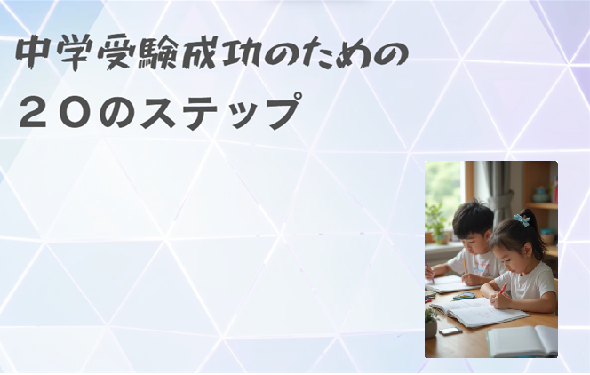 中学受験成功のための20ステップ下記文章は、このブログの2023年1月の全文章を対象に、geminiで、「20ステップに分けて、レイアウトしてください。」とお願いしてできたものです。これは受験直前に特化していますが、今後全部AIに読んでもらって、5年版、6年版を作り、5月中にリリースしようと思っています。また、受験によって育まれる「心」はとても大事です。受験後に、親御さんに感謝できる様な受験にして欲しいと思います。よろしくお願いいたします。ブログをお読みいただき、ありがとうございます。この記事がなにかのお役にたちましたら、1日に1回、以下のタグをクリック頂ければ、とてもありがたいです。にほんブログ村中学校受験ランキング大学受験ランキング