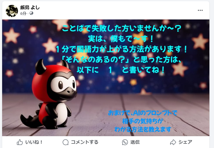 たった1分で国語力アップ!上記はFBですので、興味のある方は以下のメールにご連絡ください。無料開催。勧誘は、一切ありません。お教えするのに約20分かかります。以下は、なんの関係もありませんが、猫が好きなので、AI猫ちゃんを作りました。よろしくお願いいたします。ブログをお読みいただき、ありがとうございます。この記事がなにかのお役にたちましたら、1日に1回、以下のタグをクリック頂ければ、とてもありがたいです。にほんブログ村中学校受験ランキング大学受験ランキング