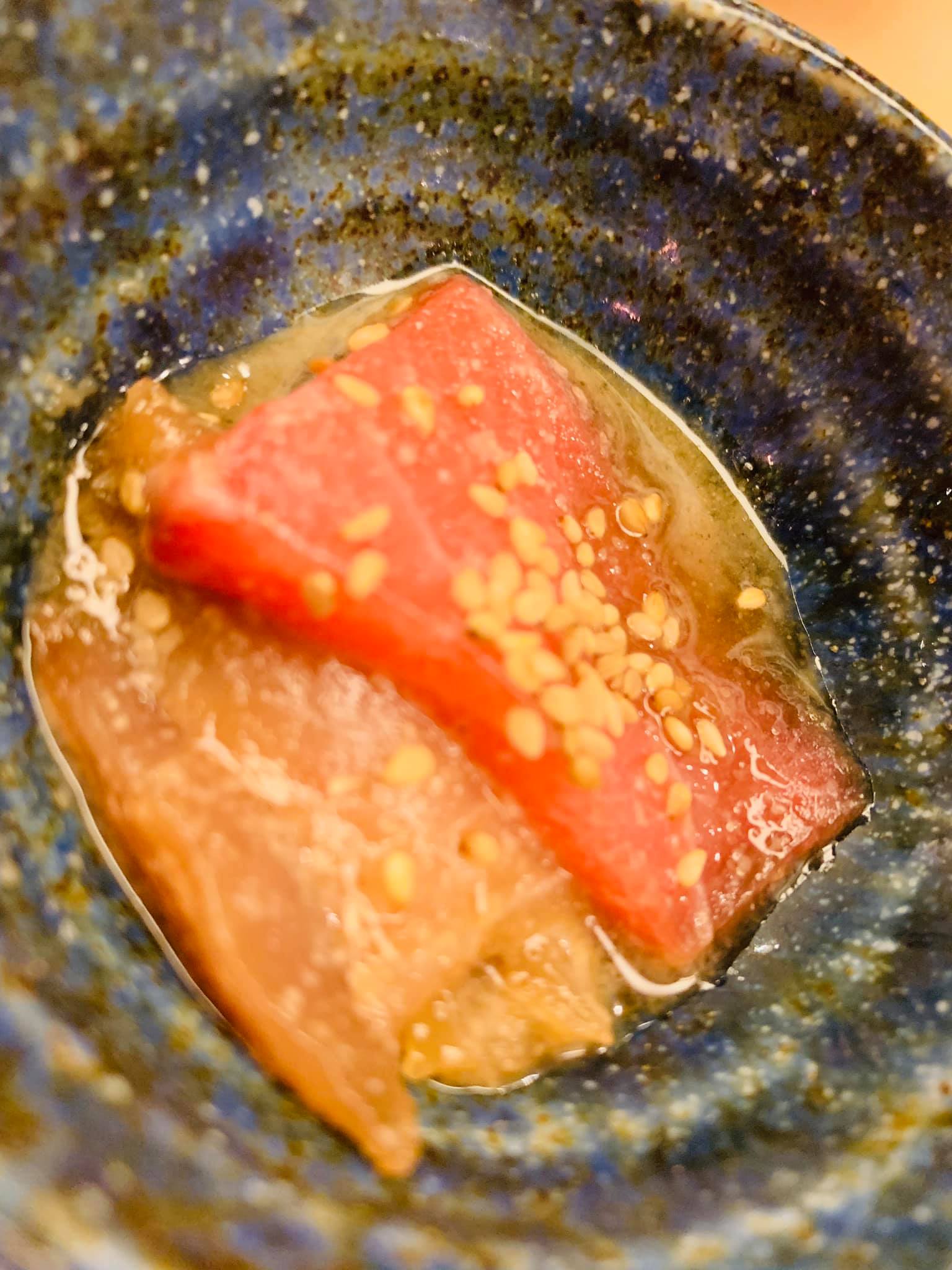 そして、ご紹介する肴の最後が「鰹の胡麻しょうゆ漬け」