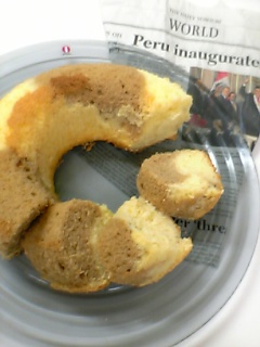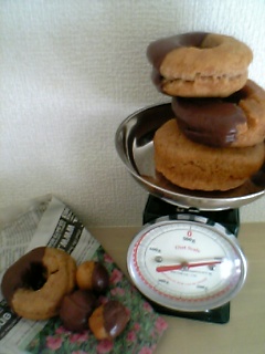 蓮くんの朝ごはん&おやつ用にドーナツ作ってみました今度は成功したかって??いえいえ、分量間違えて作ってしまいました。笑。でも味は良かった!(ホントだよぉ~~)ふかふかドーナツはパンみたいに発酵しないといけないので、今回は発酵無しで簡単なオールドファッション(チョコ味)作りましたオールドファッションドーナツ(プレーン)材料(約15個分)卵…2個砂糖…100g牛乳…大4溶かしバター…60g(レンジで加熱して溶かしておく)バニラエッセンス…少々薄力粉…350gベーキングパウダー…大1塩…小1/31.ボウルに卵と砂糖を入れて泡だて器でよく混ぜる。 牛乳、溶かしバター、バニラエッセンスを加えてその都度混ぜる。2.薄力粉、ベーキングパウダー、塩を合わせてふるい、1に加え ゴムベラで混ぜ、一まとめになるように手で練り合わせる。3.ラップで包み冷蔵室で30分程休ませる。4.打ち粉(分量外)をしたまな板にのせ、めん棒で厚さ1cmにのばし ドーナツ型、又はコップとペットボトルのフタなどを利用してドーナツ型に抜く。5.揚げ油を160℃に熱し、ゆっくりと全体がキツネ色になるまで3~4分ほど揚げる。 箸で穴をくるくる回しながら揚げると穴が小さくならない。*****************************************ってな感じで、一個のボウルに材料を入れていくだけなので簡単でしたチョコ味にするには、薄力粉の350gのうち20gをココアにして下さい。ドーナツが揚げ上がって冷めたら、レンジで溶かしたチョコをかけて冷蔵庫で冷やすだけです。ドーナツ型にくり抜いた中央の丸い生地は、そのまま揚げると写真左下にあるコロコロドーナツになりますよ♪で、何を間違えたかって、この分量だと多すぎるから半分で作ろうとしたんです。そしたら牛乳を半分にするの忘れて、生地が柔らかくなっちゃったから適当に薄力粉足して作ったんです…苦笑。けっこうどっしりしてるので腹持ちがいいですね~。でも、揚げた後はかなり油っぽいのでキッチンペーパーや新聞紙で十分に油を取った方が油臭くなくて美味しかったです。早速、今朝蓮クンにあげてみた↓ドーナツ持って逃げまくる…チョコついてますよぉ~自分で拭くもん!拭いたティッシュは必ずケースの中に戻してくれるんだぁ~最近「キレイキレイ」って言うと、ティッシュとか布巾で床やテーブル、顔などをふきふきするんです~さーて、今度は何にしようかな。もうすぐハロウィンだからカボチャ系でも作ろうかな~