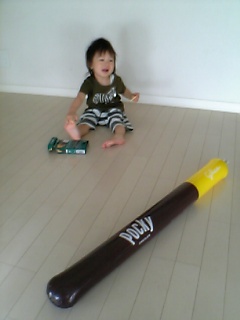 先日スーパーに行ったら、「極細ポッキー」新発売のキャンペーンでポッキーの風船(?)を配っていましたウケルでしょ?笑。でかいんだコレが、約90cmですよもちろんポッキー買わないと貰えなかったのでメンズポッキーお買い上げしたけど、蓮クン&旦那は喜んでました~(^ー^;)↑これは通常バージョンで、もう少し細いのがあってそれにはPockyのロゴの後ろに「極細」って書いてありました。その時は何で極細って書いてあるんだろう~?って思ったけど、最近CMで極細ポッキー見たのでやっと意味が判りました…苦笑。ったぁ~~!!って、予想通り振り回す蓮クンしかし暫く遊んで飽きたみたいで、すでに部屋の隅に放置されてます…。まぁ、そんなもんよね…なかなか空気が抜けなくて捨てるに捨てれない感じデス。皆さんポッキーで何が好きですか?私はメンズポッキーと、赤い箱のロースト味なんですメンズは、プリッツが普通の赤箱ポッキーよりサクサクしてるのが好きです~☆チョコもビター?だしメンズ食べてから赤箱食べるとすごい硬い気がするのは私だけ??ローストはあの香ばしい香りとほのかな甘み…あ、何か食べたくなってきちゃったと言うか、せっかくキャンペーンやってたんだから極細食べろよって感じですよね。笑。もう食べました??味は変わらないのかな?
