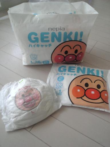 先日、近所に アンパンマンこどもミュージアム がオープンしました~(ランドマークタワーの近く)うちのまわりの幼稚園なんかでは割引券配ってたらしく、観光名所って事も重なって金土日はかなりの混みよう…。とても入れたもんじゃナイからしばらくは行くの我慢だねぇ~なんてママ友と話してました。苦笑。何かね、ジャムおじさんのパン工場とかあるらしい??(ウソだったらゴメンなさい)近くの道路にはアンパンマンの袋持った親子連れが沢山いましたよ。臨時で第3駐車場まで出来ちゃってね、交通整備に警察が出てるくらいですGWに行く予定の方は心して行ってくださいね~(^_^;)ちなみにランドマークタワーの中にあるポケモンセンターも夏休みとかは運が悪いと入るのに2時間待ちとかですからこちらも要注意ですよ~。普段は空いてるけどね。で、ミュージアムのオープンに合わせたのか知らないけどオープンと同日にアンパンマンの紙オムツ「GENKI!」も発売されましたね。可愛いから買ってみたさ~笑。値段はLサイズ26枚入りで約1200円!と高級アリエナイ~~~でも結構売れてるんです。急遽、首都圏だけ先行発売に変更されたらしいのでやはりミュージアムのオープンに合わせた気がしてならない。苦笑。だってミュージアムの近くには、トイザラスと西松屋があるんだよ!なんでこんなに高いのかって、多分オムツの中にあるギャザー?みたいなヤツのせいかな。あとアンパンマンの使用料ね。笑。調度、股間のところにこのストッパーがくるのでウンチが前まで行かないでポケットの中に収まるって事みたい。意味わかるかな??私の手がウンチだと思ってもらえると…(笑)そこから先には行かないって事ね。でね、グッドタイミングで蓮くんウンチしましたよ若干ゆるめだったからかも知れないんだけど、思いっきりギャザーの上にものっかってましたから~!!!う~ん…。いや確かに大部分はポケットの中に収まってましたよ。でもギャザーの上も高確率で汚れるね!超微妙~~普通のと比べたら、前は汚れ難いけども…。値段が値段なだけにもっと完璧を求めてしまうなぁ~。サイドの切りやすさは普通かな。ムーニーと同じ位。ちょっと力がいる感じ。大きさもムーニーくらい。手触りもちょっとイイけど、メリーズくらい。うちはグーンなので、手触りとサイドの切りやすさはグーンの方が良かったです。あとお尻がスリムでゴワゴワしない。なので~~、もう買わない…かなぁ~~??でもカワイイんだよぉ~~!カワイイから使いたい!!って感じですね。ほらね~~!!?カワイイでしょ~~~?ウンチしそうな時だけコレ↑で、あとはいつものヤツって方法もあるね。だって高いもの~。毎回毎回はなんか勿体無くて使えないよぉ。義母のうちに遊びに行くとオムツを買っておいてくれるのでそっちでおねだりしようかなぁ~と思ってます…f(^▽^;)7枚入りくらいのお試しパックがあるのでまずはそちらで使い心地を試した方が良さそうですよ