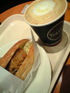 タリーズコーヒーで、ハニーミルクラテとチキン南蛮サンドをいただきました。