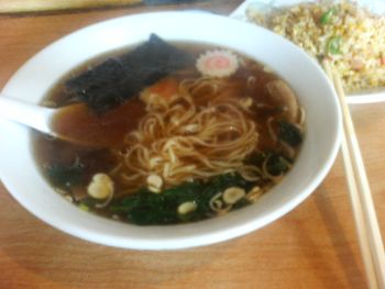先週は後半頃から忙しくて土日も出勤した。それで、なかなかブログを更新できなかったのである。そんな訳で昨日の日曜日は、会社の近くにある中華料理店で昼食を食べた。高根沢町のスーパーオータニの前にある大楽軒(だったかな?)という地元の人しか利用しなさそうなお店だ。正直女性が一人で入るには勇気がいるであろうと思われるほど、店の中は余り綺麗ではない。ときとしてこういう店の中には美味しい店もあるので、騙されたと思って暖簾をくぐった。 厨房は、太った奥さんと痩せた旦那さんが並んで居られないほど狭い。健気にも中学生のお姉ちゃんがお店の給仕を手伝っていた。自分は厨房が丸見えのカウンタに座って様子を見ていたが、中華鍋の振り方はまあまあ良かった。 注文したのは、ラーメンと半チャーハン。どちらもまずまずの味だったが、気になったのは麺が若干古かったせいか、ちょっと腰が足りなかった。半チャーハンは、若干塩気が足りなく、出来ればハムでなくチャーシューを刻んで入れてほしかった。ラーメンが450円で半チャーハンは400円。半チャーハンと言っても普通のチャーハンと言っても可笑しくないほどの量だった。正直お腹が一杯で、「腹の皮が突っ張ると目の皮が弛む」の例えよろしく、午後のお仕事が眠気との戦いになるとは思っても見なかった。■ラーメン(一口食べてから気が付いて撮影)■半チャーハン(一応飯粒はパラパラです)