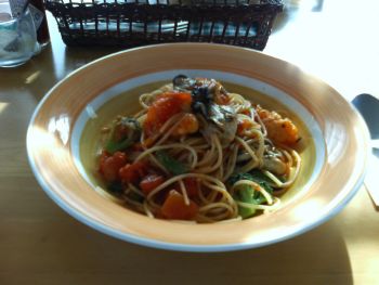 土曜日のお昼には、高根沢町にある「よう食屋さん」でランチを頂いた。妻は、ミニハンバーグ・トマトソースパスタを、自分は牡蠣貝と野菜のトマトクリームパスタを注文した。相変わらずこちらのランチは、スープとサラダとデザート・ソフトドリンク付で千円也と、とてもお得な感がある。この日のスープは、アサリと海草の和風スープ。サラダはルッコラのチーズドレッシング和え。どちらも栄養のバランスの取れた料理という感じで、味もなかなか美味しかった。この日のメニューで特筆すべきはデザートで、カシスのケーキと胡桃のシフォンケーキ、パンナコッタのイチゴソースかけの三点盛。この値段でこれだけのデザートが出るとはちょっとうれしい。酸味のあるパンナコッタとカシスのケーキを頂いた後、お口直しにシフォンケーキを頂くのが良いかも。勿論、メインのパスタも美味しかった。