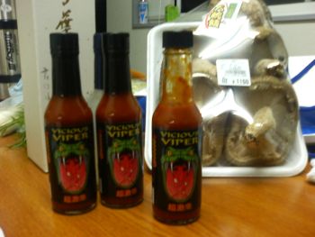 鏡開きが木曜日だったので、昨日の夕方には会社の神棚に飾ってあった鏡餅を出勤している社員の人数分切って、取締役のM氏が率先して雑煮を作っていた。どうやらお昼に高根沢町にある「元気あっぷ村」に行って、ランチのついでに食材を買ってきていたのは、そのためであった。午後6時半過ぎに給湯室からいい匂いが漂ってきたと思ったら、そのうち全員集合がかけられて、早速雑煮が振舞われた。 ここでまた例の辛い物好きの社員が仕入れてきた「VICIOUS VIPER(邪悪な毒蛇)」という香辛料を持ち込んでいたことに気が付いた。このソースの辛さは約250,000 スコヴィルで、普通のタバスコの100~200倍の辛さだと言われているらしい。これを雑煮残り汁に一滴垂らして飲んでみたらさすがに超辛い。なんだか飲んだ瞬間はたいした事はないと思っていたのも束の間、口の中やら唇やらがピリピリしだした。この間試したハバネロも凄かったがこれも凄い。そしてお腹もなんだか温かくなって、体中が火照り出してきた。でもなんだか癖になるような美味しい辛さだった。それにしても夕刻の雑煮会とは、うちの会社はなんだか面白い。 追伸 この激辛ソースは超激辛.COMで輸入販売を始めたらしい。我こそはと思う方はお試しあれ。■美味しかった雑煮の残骸