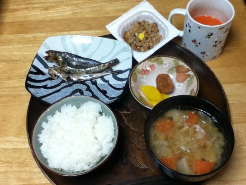 この間までは確定申告、それと年度末の納期のプログラミングやホームページ更新(県内の某大学某学部のサイト更新)のお仕事なんかで、忙しくてブログサボってました。久し振りの閑雅な朝食です。紀州産南高梅のハチミツ漬けの梅干し、メザシ、北海道産の大豆を使った納豆、国内産豚肉を使った豚汁とまあ、オール国内産の食材を使った純和風な朝食を頂きました。日本人で良かったなぁと思いますわ。ちなみに野菜が足りない分はめいらくの野菜ジュース(これが中身が何が入っているのか不安といえば不安ですが)で補っております。