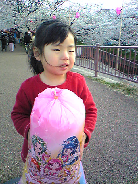 近所の川の桜が咲きました。見に行きましたが風が強くて大変でした。プリキュアのわたがしが何度も飛ばされました…。