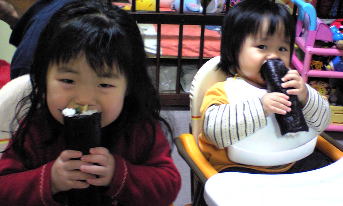楽しい節分!と言うよりおいしい恵方巻き!! レッツ!恵方巻き!!今年の恵方は南南東~ どうぞ~!! 一生懸命食べております!! 食べております。 食べました! お姉ちゃんはちょっと残しました。 竜は食べ散らかし放題で、1本食べちゃいました。 ・・・・・食べすぎっ