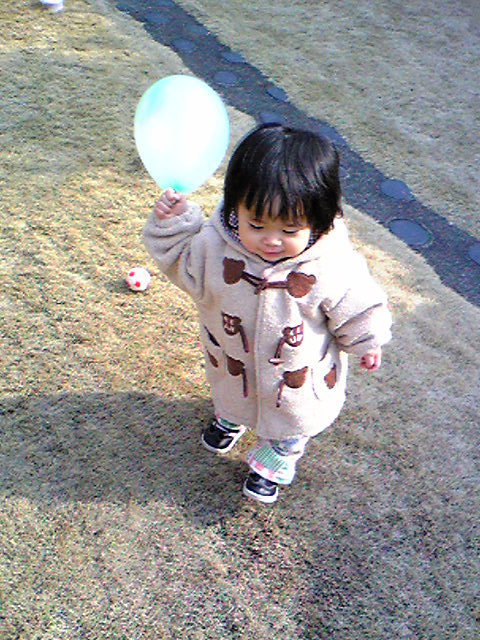 風船を持っただけで、大喜び走る走る 転ぶのはいいけど、起き上がる時についでに地面をなめてみるのはやめて…。