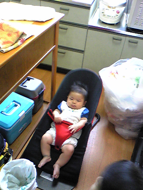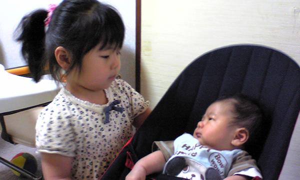 お姉ちゃんは赤ちゃんがめずらしくて覗きこみます「赤ちゃんだねぇ」なんて言いながら。でも、お兄ちゃんはマイペース。全くと言っていいほど何が起きているのか解ってません。円座の椅子に乗っていたらハマって、ぬけなくなりました・・・。