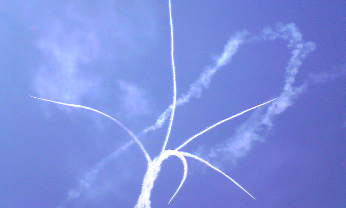 航空ショーを基地の川向から見物しました。ブルーインパルス? すごかったです。実は、前日、超晴天の風もあまりない運動会中練習を見てしまっていたのですが・・・。ハート型と星型の飛行機雲。大きすぎて携帯のカメラでは撮れません。