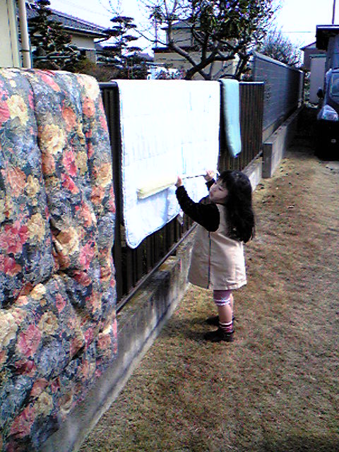 「お手伝いするの~!」 と、こたつ布団などなどはたくのを手伝ってくれました。 棒状のものに興味があるようで…、 このあと上機嫌のまま持って逃げ回り、取り上げるのに苦労しました。