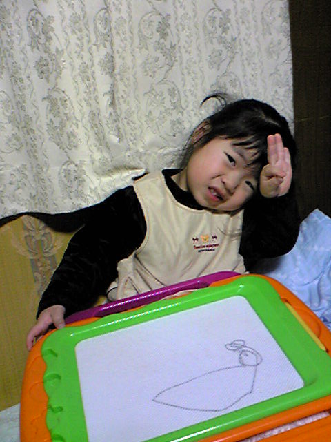 「バナナ!バナナかいたのぉ~」 と見せてくれました。 おぉ!バナナに見える! ということで記念撮影。 偶然かもしれないけど、いろいろできるようになっていくんですねぇ。