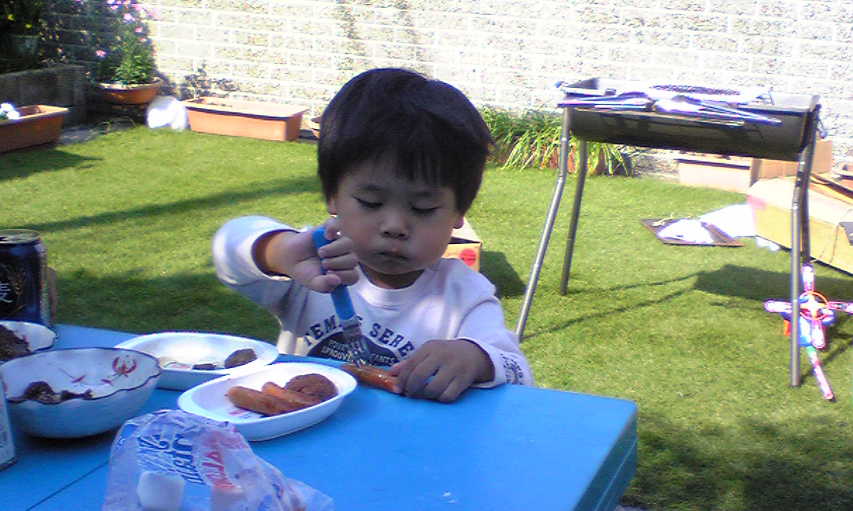 竜くん、お誕生日おめでとう これからがんばりましょうね。よいお天気でしたので、庭でバーベキューをしました。庭だけど外で食べるのは楽しいねぇ