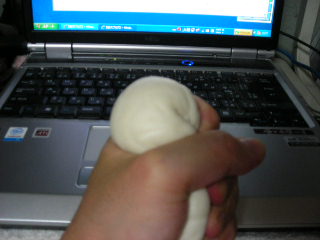 息子が児童館からもらってきた、おもちゃのあんまんは、感触は本物そっくりです。だから、にぎるとこんな感じです。 つぶすとこんな感じ。 でも、手をはなすと、もとに戻ります。