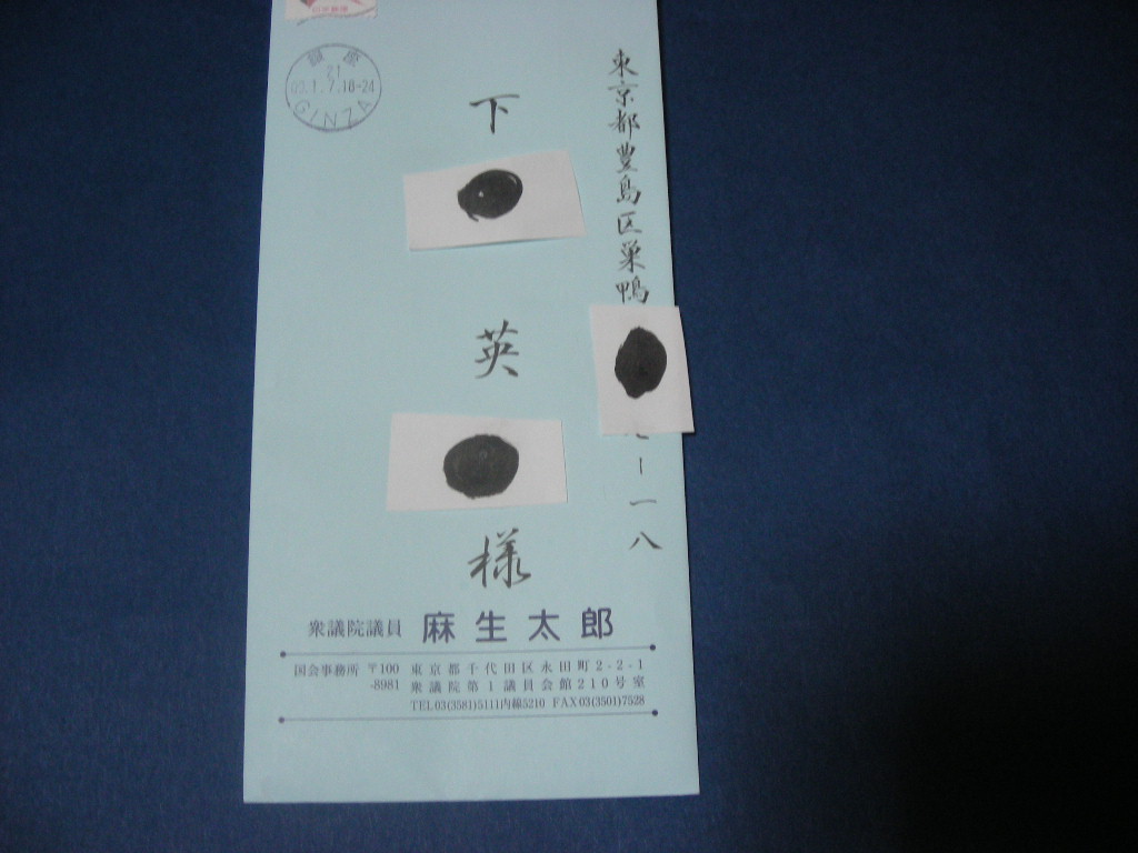 ママが12月に首相官邸の麻生総理大臣あてに、クリスマスカードと手紙を出しました。そうしたら、なんと、麻生首相から、今日、手紙が届きました。首相が書いたのをコピーしたものですが、印はコピーではないし、もしかしたら、首相がママの手紙を読んでいる可能性も高いです。写真はこちらです。↓