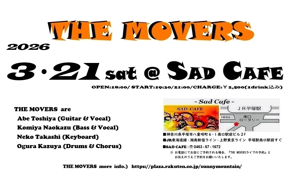 「THE MOVERSのライブ予約」とお伝えいただいたうえ、ご予約をお願いいたします。