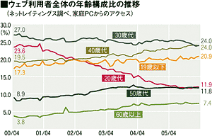 7年前の4月に30歳20歳代がPCの家庭利用者の主流を占めていた20歳代が2005年には11%台まで急降下してしまっているのである。詳しくは「 パソコン見放す20代「下流」携帯族 」より