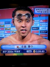 日本期待のエース北島選手が復活した。金メダルおめでとう!!。ファイナリスト8人の決勝スタートリスト、センターコースには日の丸♪
