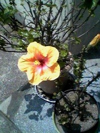 大笑い 前述6/5付ブログ に続いて、もう一つの鉢、うれしい黄色いハワイアン・ハイビスカスが咲きました(‐_^)☆。こちらも全部葉を落とし心配していましたが、次の蕾(右側)も出来ているので夏の間、私たちの目を楽しませてくれることでしょう。