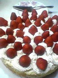 「三段重ねにしてぇ~~!!」 と言って完成したのがこれ 。ぎりぎりに調達できた小粒のイチゴが実に甘くて美味しかった。