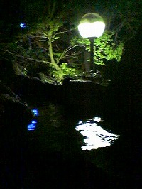 箱根の強羅温泉に一泊しました。食事のあと失礼して、誰もいないお風呂でパシャ!。ライトアップされた緑が静けさの中に癒しのシーンを醸しだしています。