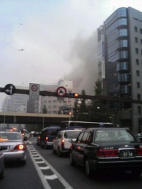 営業の外回り中にスタッフが遭遇、クルマの中から撮った写真。ヘリコプターも2機空に舞って、煙がもうもうと立ち上って不気味です。