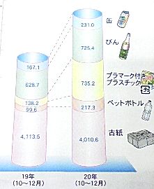 上の図は、分別リサイクルされた資源です。10月~12月の3カ月の平成19年度比、プラマーク付きプラスティックが約600トンと著しく増加しています。 -目黒区広報誌より-
