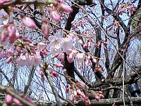サクラの開花宣言の出たこの日、園内の しだれ桜 (蕾が下向きなんですね)もほころんで、ピンクの花びらが綺麗に開いていました。携帯のフォーカスマニュアルで接写です^^v。