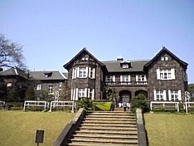 武蔵野台地の高低を利用して北側の高台に洋館、下へ降りていくと滝を擁した池をめぐる日本庭園が広がっています。