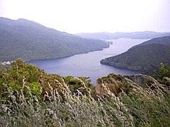 手前は湖尻、奥が元箱根、左の山が箱根最高峰の神山1,438m。ちなみに、芦ノ湖の湖面標高は725mです。