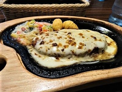 ぺろりフォンデュ風ハンバーグを注文、とろとろチーズで美味しく頂きました。買い物すませて、風雨が強くならないうちに帰宅しました。