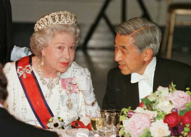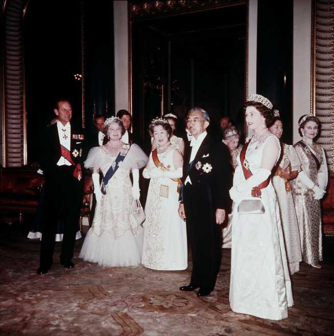 1971年10月、バッキンガム宮殿での晩さん会に臨む(右から)エリザベス女王、昭和天皇、香淳皇后、女王の母エリザベス皇太后、女王の夫フィリップ殿下