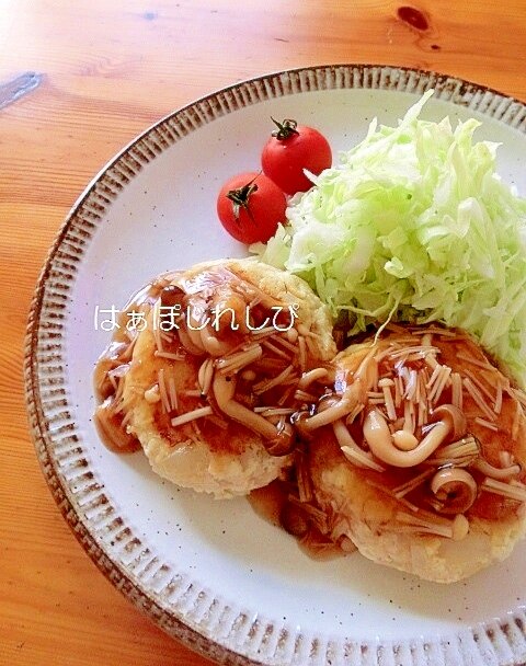 お肉なし♪豆腐ハンバーグのきのこ甘酢あんかけ✿料理名:きのこ甘酢あんかけ豆腐ハンバーグ作者: はぁぽじ■材料(2~4人分)木綿豆腐 / 300g玉ねぎ(みじん切り) / 1/2個しめじ(石づきをとって小房に分ける) / 50gえのき(石づきをとって1cmに切る) / 50g溶き卵 / 1個分生姜(すりおろし) / 小さじ1と1/2塩・こしょう / 各少々パン粉 / カップ1~1と1/2〇めんつゆ(3倍濃縮) / 80ml〇水 / 80ml〇酢 / 大さじ2水溶き片栗粉 / 片栗粉小さじ2+水小さじ2ごま油 / 大さじ1/2■レシピを考えた人のコメントお豆腐だけのハンバーグです。甘酢あんはめんつゆをつかった簡単なものです♪写真は1人分(我が家は2~3個)ですが手のひらサイズのもの4~5個分できます!詳細を楽天レシピで見る→