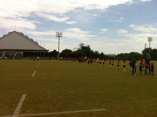 1日遅れましたが、日曜日に開催された第6回 熊野カップの結果報告です。晴天となりものすごく暑くなった今大会でしたが、気温に負けない、とても熱い試合が多くすばらしい大会となりました。鈴鹿RSの生徒達は今回の大会に間に合せたNewジャージを身にまとい、グラウンドを『勇気』と『集中』のスローガンを胸に、成長してきた姿を私達にみせてくれました。うれしい結果、悔しい試合、色々ありましたが最初から最後まで誰も諦めていない姿に感動させて貰いました。【Cグレード 試合内容】・Cグレードは昨年度鈴鹿RSが優勝しており、今回は2連覇が掛かってました。 結果ものの見事に全勝で優勝を勝ち取り2連覇を達成しました。 Cグレードの皆、優勝おめでとう!Cグレード来年は3連覇だ!今回から鈴鹿RSはカップと賞状等はその大会でのMVP選手がスクールの代表として持ち帰れる、マンオブザマッチ制度を導入!優勝カップと賞状を勝ち取ったのは…2年生のこの二人、おめでとう! 【Bグレード 試合内容】・今年のBグレードは全てのゲームが大接戦! 好ゲーム連発でどのゲームも見応え十分でした。 やるべき課題が明確になり、みんな秋の県大会でのリベンジを誓っていました。Bグレード生徒諸君今日の悔しさを忘れず、これからの練習頑張ろう。秋の県大会で雪辱や!!【Aグレード 試合内容】・Aグレードは1試合目、成長の証を発揮してくれ格上のうめぼしJr に対し一歩も引かない試合をしてくれ、 後半開始すばらしい集中力で連続攻撃からTRYをとりきり同点に! しかしそこから突き放され敗退、2試合目の四日市RSとの試合は 連戦となってしまい、試合開始から動きが鈍く大敗。 敗れはしたものの最後まで諦めず、格上の相手に向かって行く 姿に感動させてもらいました。 予選リーグ全敗してしまい、5位6位決定戦にまわったAグレードでしたが 最終戦は気持ちを入れかえ、キックオフからノーサイドのホイッスルが鳴るまで 誰一人集中力をきらす事無く、最高の試合を見せてくれました。Aグレード 生徒諸君!今回の熊野カップは自分達の課題がはっきり見えたと思う。秋までに強化すべき課題はわかったので、これからの練習『勇気』と『集中』を忘れずに頑張って行こう!最後は全員で記念撮影!みんなNewジャージに負けてへん!めっちゃかっこええぞ!最後に熊野市ラグビー協会の皆様、参加された各RSの皆様ありがとうございました。コマツ様 差し入れ頂きありがとう御座いました。それと毎月合同練習で御世話になっている、津・高虎RSの皆様、Aグレード初優勝おめでとうございます。今後も合同練習で御力添え頂けます様よろしくお願い致します。