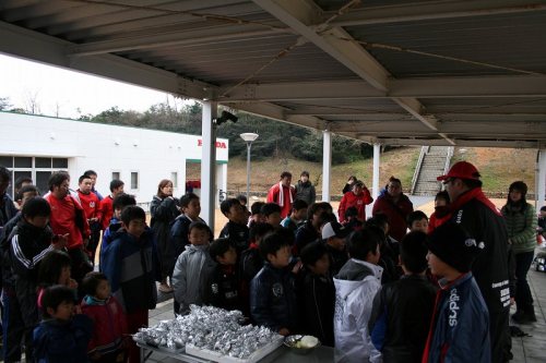 昨日の練習終了後、HondaアクティブランドBBQ会場にて 忘年BBQ大会を開催しました! とても寒く雨の降る中ですが、HALのBBQ場は全天候型 屋根付きなので安心です。・BBQ開始前に話を聞く生徒達・さあBBQの開始です!・皆 肉にまっしぐら!・鈴鹿RSのイベントのお肉は西条にある『くすの木』で購入しています! いつもありがとうございます。安くて美味くて最高です! 『くすの木 最高!』 皆さんお肉はくすの木で買いましょう! ・急に前が曇りました…・その正体は、鈴鹿RS名物の猪汁でした! 超巨大寸胴に用意された量はざっと120人前! 猪は猪突猛進! 大きな相手にも果敢にアタックして欲しい! 鈴鹿RSの母こと加藤コーチの愛情こもった味を 全員で堪能しました。・うめ~ あったまる~・おいしいからおかわりしなくっちゃ(笑)・皿ごといっちゃいますか(笑)・練習試合に出発前のHEAT 小西選手/山路選手も 鈴鹿RS特製 猪汁に舌鼓! 試合頑張って下さい!・食べて一息ついたらすぐ横でタッチフットが始まりました(笑) 皆 腹いっぱいよく食べました! これで今年の鈴鹿RSの活動は一旦終了です。 2013年 本当に皆よく頑張りました。 2014年もよりステップアップ出来る様に頑張りましょう! 感謝の念を忘れずに! 『勇気』と『集中』で日々チャレンジです! それでは皆さんよいお年をお迎え下さい。 メリークリスマス!! ※年明けは1/12(日)新年チャレンジマッチ&餅つき大会です。