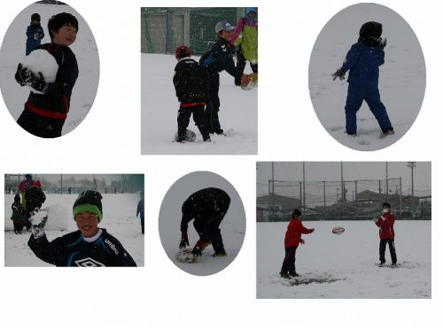 皆さんこんばんは!この週末は全国の高校生が一世一代の大勝負!センター入試日!毎年センター入試の時期は寒くなるのに今年は暖かいなぁ~♪なんて思っていましたが・・・そんなことはありませんでした(><)早朝、妙に世間が静かだと思い窓を開けるとそこは白銀の世界になっていました!!今季初の積雪!!止む気配をみせず深々と降っている雪・・・こんなに雪が降っていたら・・・・ラグビースクールお休みやったんでしょ??なんて思ったPC前のあなた!!鈴鹿RSを甘くみてはいけません!!我が鈴鹿RSは多少の悪天候でも練習をします!!それぐらいラグビーが大好きで熱い情熱を持った人が集まった集団!それが鈴鹿RSなのです!!(もちろん強制参加ではありません。無理をせず、参加したい人は来てください!というスタンスですので、スパルタなのではとご心配なさった方はご安心ください!!)練習前の風景~グランド一面の雪にテンション↑↑な仲間たち~雪降る中練習にたくさんの生徒が参加してくれました。さらに!!2名の体験入校生が来てくれました♪CグレードとDグレードに参加♪それでは本日の練習内容レポート!!Jrから紹介します!!雪とか関係ないです!ラグビーやります!!と逞しく練習をしていました。そしてミニではA・BグレードとC・Dグレードそれぞれ合同で練習をおこないました。A・Bグレードは流石Jrに負けじとタッチフット大会が開催されていました!!キャプテンから副キャプテンにナイスパス!!っと思いきや・・・・まさかのノックオン(><)この寒さでは仕方がないよ!!でも、尋常じゃない悔しがり方をしていました(笑)悔しい分だけ上達できる!!コーチ達も真剣です!さすがA・Bグレードのお兄様たち!約1時間延々タッチフットをしていました!そんな中、C・Dグレードはと言いますと♪みんなで仲良く雪と戯れていました(^^)雪合戦をしたりぃぃぃ♪雪を丸めてみたりぃ♪「ん?なんか妙にデカくない??」っと思い様子をうかがってみました♪出来上がったのは巨大なカメでした♪それを見ていたDグレード!負けじと大きな雪の球を作り出しました!!こんなに大きいの作ったよ♪Dグレードは雪だるまを作りました!!本日は約1時間の練習で終了しました!!本来、雪の積もったグランドは水を含みグチャグチャになっていくのですがHALの人工芝で練習させてもらっているためドロドロのグチャグチャになることなく練習を終えることができました。最高に素晴らしい環境でラグビーをしているんだ!ということを再認識しました。HondaHEAT 様に心から感謝です。さて、来週の鈴鹿RSは「HondaHEAT応援Day」近鉄花園ラグビー場でおこなわれるHondaHEAT 対 サニックスの応援に行きます!本日、駒沢陸上競技場でおこなわれた三菱重工戦で 28-19とHondaHEAT 勝利!!来週の試合に勝利したチームがトップリーグに自動昇格という大一番!絶対に負けられない戦いです!!鈴鹿RSの元気いっぱいの声援でHondaHEATに勝利をもたらしましょう!! 今ここで魅せるぞぉ♪ われらの熱き魂ぃぃ♪ いつまぁでも輝くぅ♪ われらぁヒート♪ホンダァァ♪ ヒート!ホンダ!!ヒート!ホンダ!!最後に鈴鹿RSのギャング!!この写真の後にカメラとコーチが雪まみれになったのは言うまでもありません(笑)このギャング・・・ホンマにエエ顔してるわ(笑)