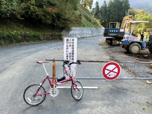 大血川林道編の続きです。 10:07頃、雲取林道起点に到着。雲取林道舗装路終点の荒沢橋から往復3〜4時間のハイキングがありますので、この時間に到着しないとマズいのです。そんなわけで早朝から大血川林道を上ったわけです。 相変わらず人の気配のない林道です。柔らかな陽射しで雰囲気が良いです。路面がまともな最初のうちは(笑)。 鮫沢橋から先は通行止め。昨年来た時は簡単に動かせちゃうバリケードでしたが、今は頑丈なゲートで、鍵までかかっています。人や自転車は脇から入れますが。 全面通行止めも当然で、路肩がヤバいことになってます。 白石山。廃屋の辺りからは視界を遮るものがなくて素敵な景色。 路面が荒れ放題の切り通しとかを通過。荒沢橋手前は道路の四分の一くらがごっそり落ちていました。補修する意思が全く見えません。 11:24頃、荒沢橋広場に到着。右側の小屋に「熊に注意」の文字が書かれているんですが、扉が微妙に空いていたり小屋の壁が破れていたりで、中に熊がいそうでイヤです(^^;。 例によって案内板に自転車を括り着けましたが、昨年はあった案内表示が消えていました。 鮫沢橋に続き、荒沢橋広場から先も全面通行止め。ここから先はダートと言うより廃道、更には登山道レベルです。 岩が見える部分が雲取林道です。太陽が高くなって紅葉の発色も美しくなりました。 部分アップで。 道幅こそ車道ですが、勾配は車道レベルではないです。しかし驚いたことに、帰路にこの先にトヨタのHiluxが駐車してありました。パワーがあるし車高も高いのでダート走破も容易でしょうが、横が崖なのに道幅ギリギリという感じで、よく入ってくるなぁ。というか、二ヶ所のゲートの鍵を持っているみたいで、一体何者? 崖を被う紅葉が美しいです。 雲取林道ではこれをよく見かけました。鹿の糞みたいですね。 大洞川は遥か眼下に。 歩いてきた道を振り返ると、崖道がよくわかります。 落石、崩落なんでもあり。 しまいには落石で道路が埋もれてしまいます。湾曲した沢筋や谷筋は日陰で、落石も多く荒涼とした雰囲気です。さすがにこうなると自動車の進入は不可能。 しかし雲取林道は白石山の南を走っている為、基本的には陽が良く当たります。陽の当たる場所は静かで平和な雰囲気です。紅葉の時期は葉が落ちているので更に明るいのでしょうね。 アップで。 東仙波の頂のひとつ。いやぁ、鮮やかです。 やってきましたよ。またここに。 道幅が30〜50cmくらいしかないです。 滑落したら100m下までゴロゴロ止まりません。スキー場じゃないんだから… 残り僅かなこの道幅はいつまで保つのでしょう。 紅葉は綺麗ですが、落石が酷くなりました。倒木が絡まって通行が面倒です。 渡り終えて撮影したものですが、落石の堆積で、足の踏み場が30cmくらいしかないです。 大血川林道、雲取林道 [3]に続きます。[オリジナル投稿日 2012.12.06 23:09:40]