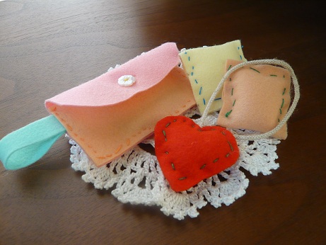 夏休みも、残りわずかになりましたもう、新学期が始まっている学校もありますねこの夏休み、娘が縫物をやりたがったので、少し、教えてみました。幼稚園の年長さんの娘。いつまでも、小さいと思っていた手ですが、しっかりと針を持っていました。チクチクチクチク・・・・・・・。なみ縫い。真剣な眼差しで、縫い目もそろえて、頑張りました。フエルトの色。刺しゅう糸の色。ボタン。娘が選んで作りましたふた付きのアクセサリーポーチ。赤色のハートのストラップ(表には、フエルトで名前を張りつけました)リカちゃん人形の枕、2個(正方形)私も小さい頃、フエルトでいろいろな物を作っていました楽しかったなぁ*************おまけ・・・。私も、フエルトで作ってみました。スイーツアイスボックスクッキーに、マカロンです