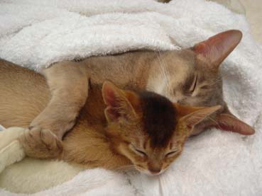 実家に行った息子のプリンを毛繕いするまろめの写真です。
