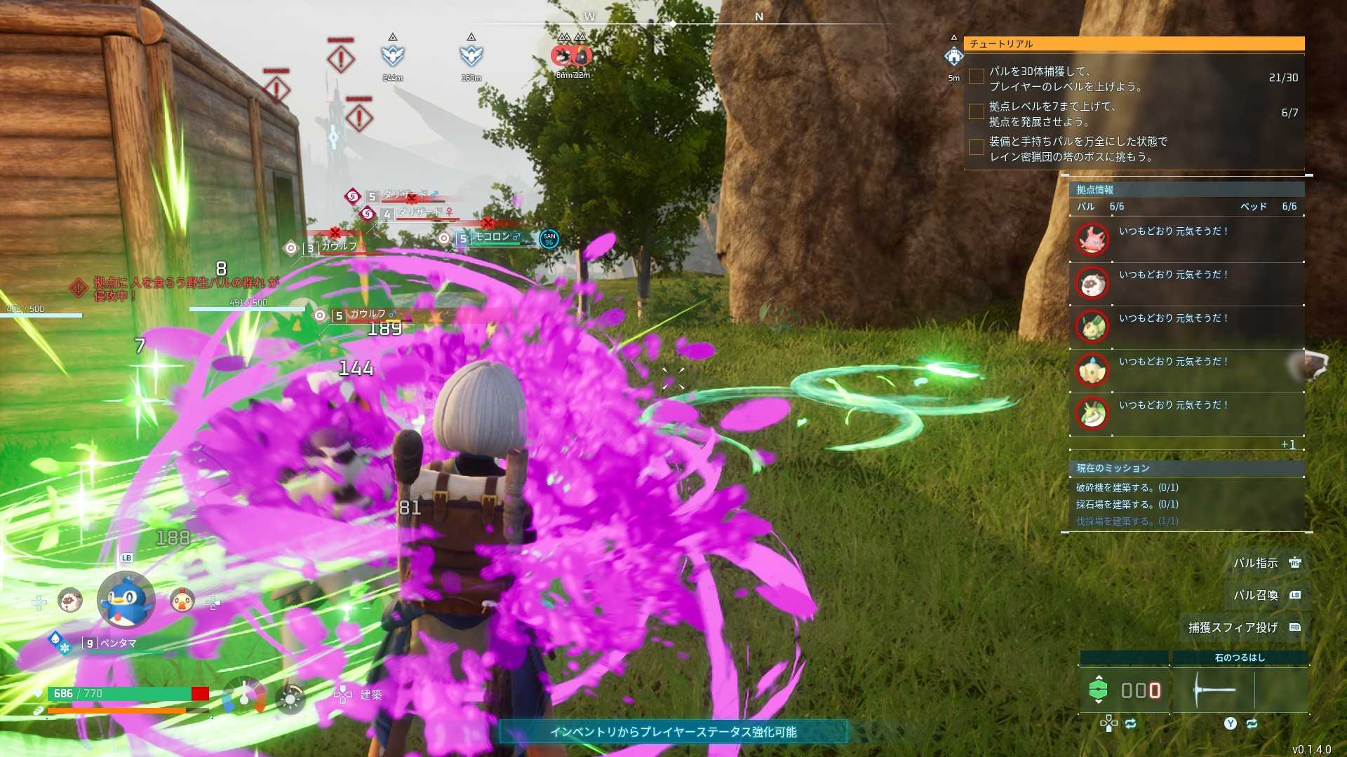 拠点はパルやパル愛護団体という敵に時折襲われます。拠点を攻撃してくるパルは普段のフィールドでは見かけないパルだったので全力で捕獲!2種類いたのですが、拠点にいるパルたちが一斉攻撃するので1匹しか捕獲出来ませんでしたHPがゼロになったパルはパルボックスに戻して10分経過すると再び使えるようになります。リアルタイムで10分待つ必要があるので、意外と不便です。