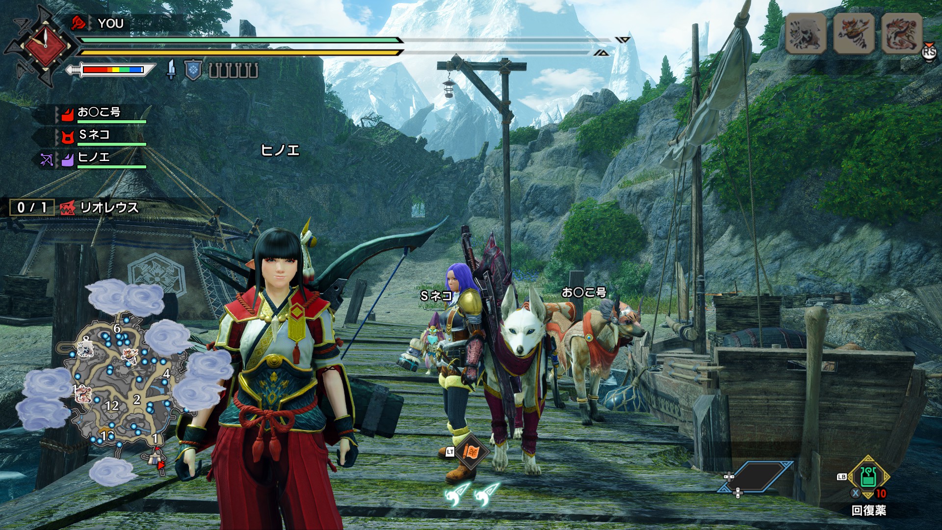 ヒノエとミノト姉妹を連れているだけで幸福度高くなります。姉妹に狩猟笛を持たせてあげるととても活躍してくれるので、その点もグッドです。セルレギオスも初めて戦うモンスターで見た目は飛竜種。今度こそリオレウス系の動きかと思いきや、ライゼクス系の動きでした。しかも、高速でキックしてくるので回避は難しくガードがあると安全です。