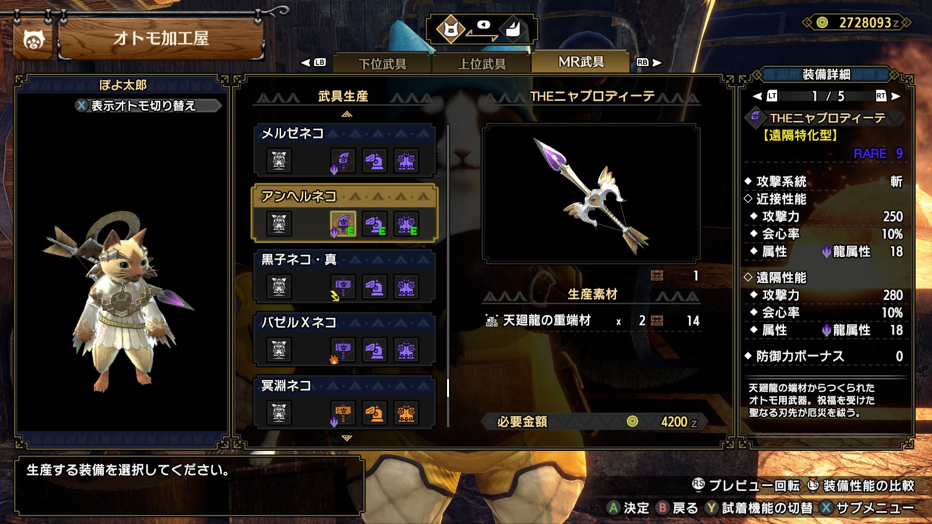 ナルハ装備を作って出た端材からアイルー装備を作ってみたのですが、めちゃくちゃ可愛いです雷属性武器なので、雷属性が弱点の敵には積極的に使っていくことにします。ライゼクスはこれまでのモンハンシリーズで初めて戦うモンスターです。飛竜種っぽいので、リオレウスやリオレイアと基本行動が似ているのかと思いきや全然違いました。空から攻撃してくるパターンが多くて、攻撃タイミングが少し取りにくいモンスターでした。