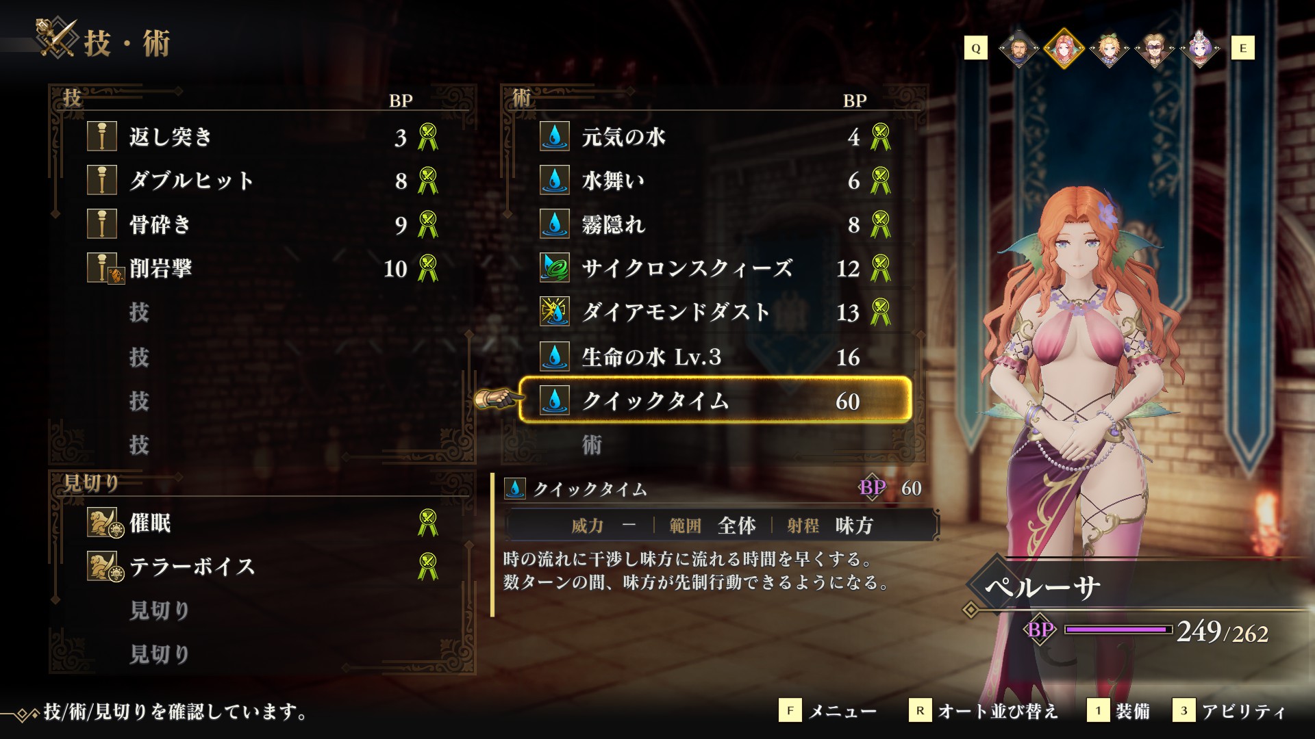ネレイド族を育成していたら念願のクイックタイムを習得しました。シリーズではぶっ壊れ術として有名な術ですが、リベサガ2では味方の行動が最速になるというものです。スタン攻撃が効く敵であれば完封できる可能性がありますね。ただ、消費BPが60なので連発出来るものではないです。ミラマーのレオンブリッジが破壊されたので犯人を捜していくと海の主に辿り着きます。和解できる道もあるのですが、原作のルートをすっかり忘れていて討伐ルートになってしまいました。海の主を討伐すると七英雄のスービエが海の主を吸収し強化されてしまいます。それだけでなく、海の主自身も強力なボスなのでできれば和解ルートをとった方が無難です。