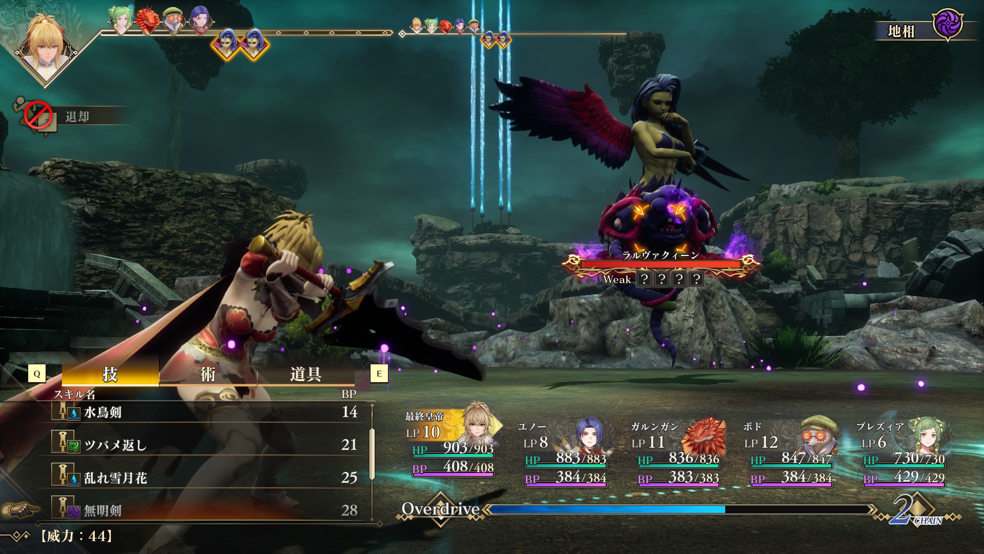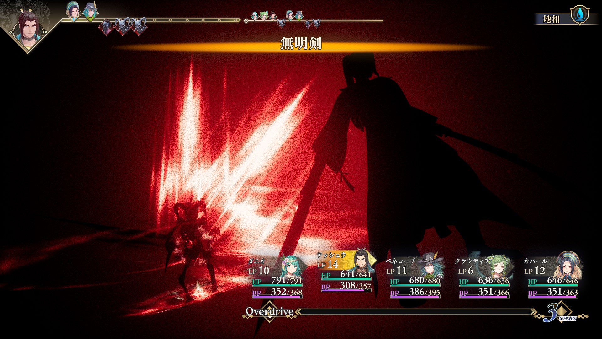 パーティーに入れたテッシュウに閃きラッシュがきました!さすが大剣の適正が高いです。まずは無明剣、闇属性を持つ攻撃で何よりも演出が非常にカッコイイ続きまして、サガシリーズの大剣技と言えばこれ。乱れ雪月花です。技の途中部分ではなく、繰り出す前の部分を捉えてしまいました。こちらも相変わらずのカッコイイ演出かつ高威力の素晴らしい技です!