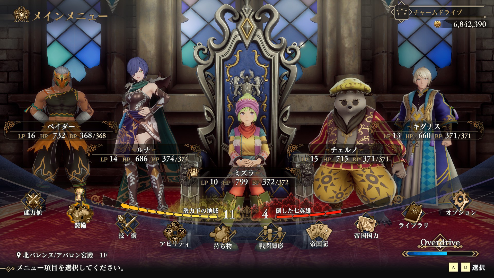 クジンシーを倒してアバロンに戻ると文官がナゼール海峡の南方にある大氷原にモンスターが集結しているという報せを受けます。七英雄のうち6人を撃破しているので、いよいよ最終決戦が迫っているということです。せんせいをこつこつ発見してきましたが、45人(匹?)目のせんせいを発見すると仲間アビリティ装備枠が+1されました。アビリティの付け方次第で戦略が大きく変わるので、このごほうびはとても嬉しいです。タンク役を更に固くしたり、アタッカーの攻撃力を底上げしたりと色々考えてみたいと思います